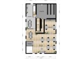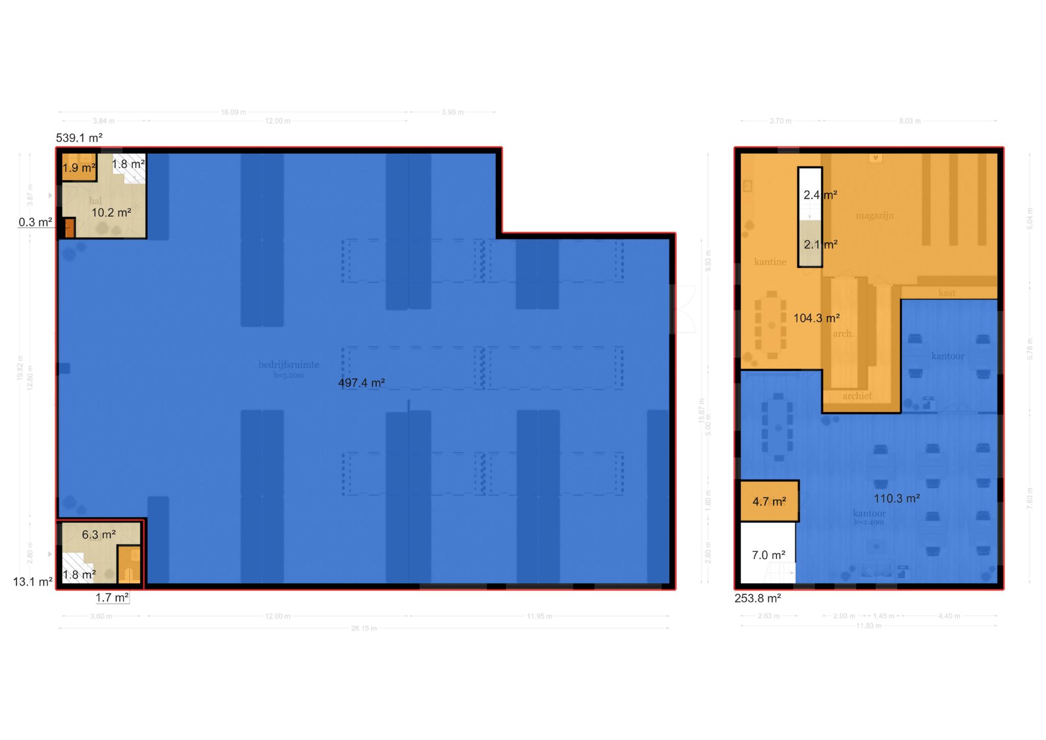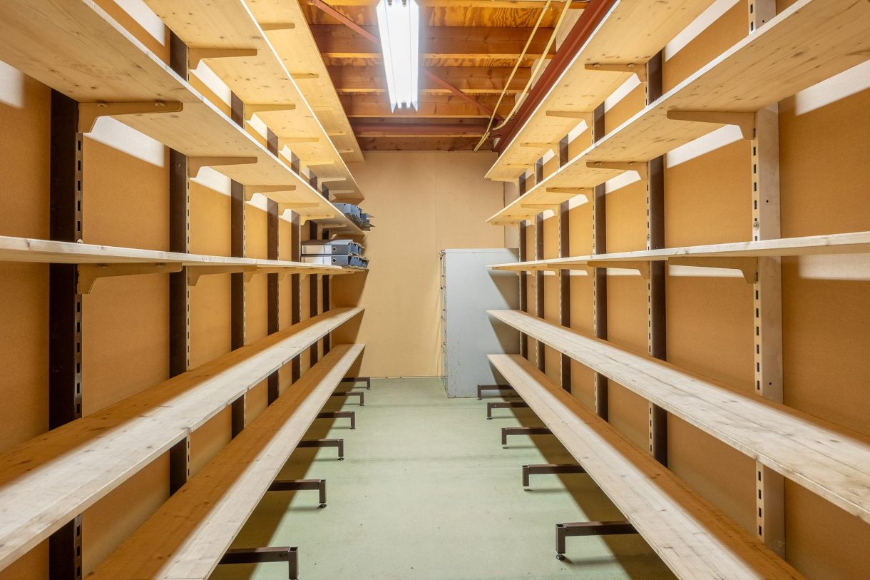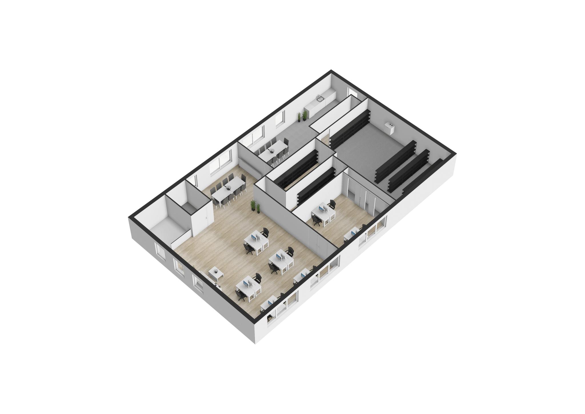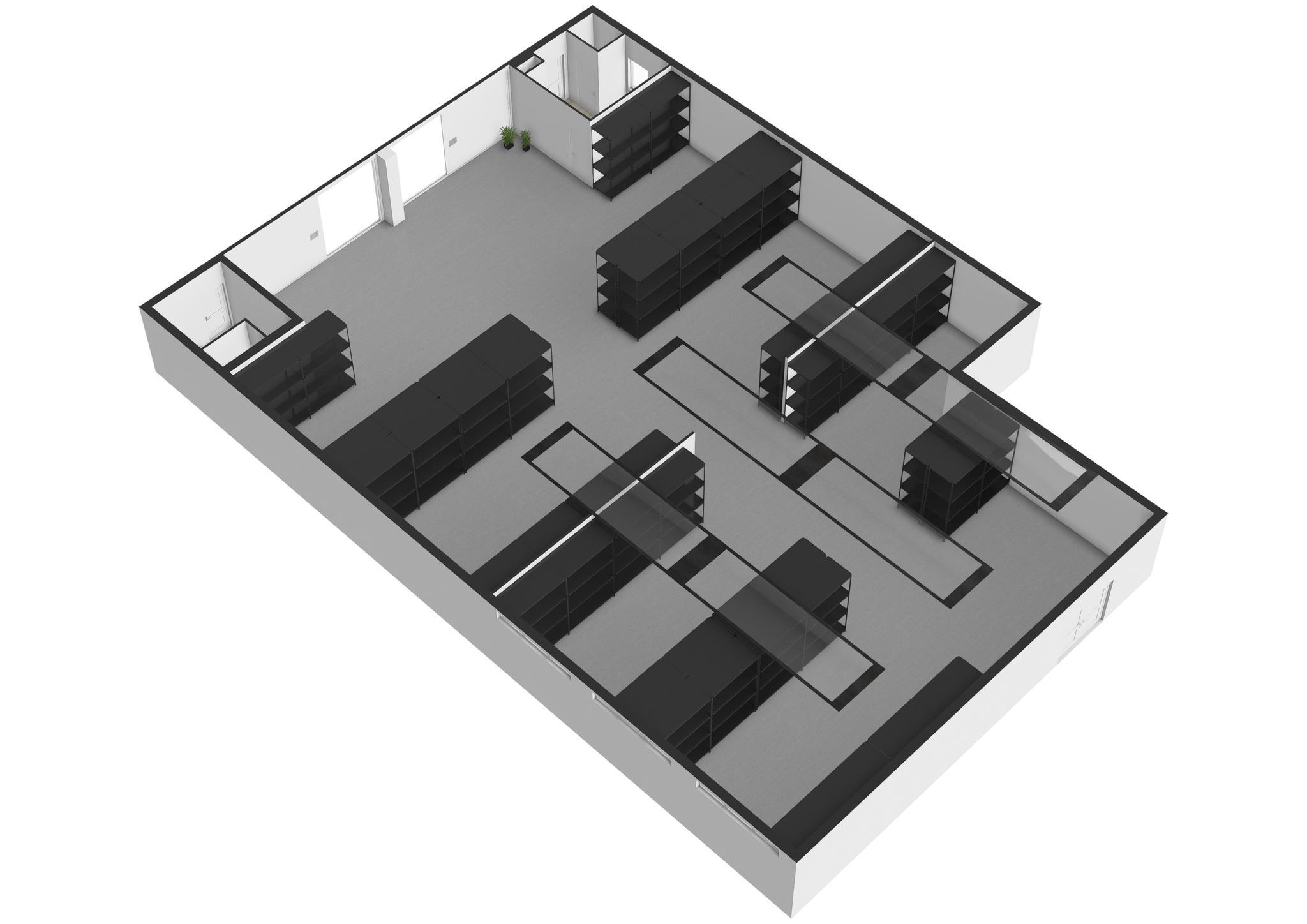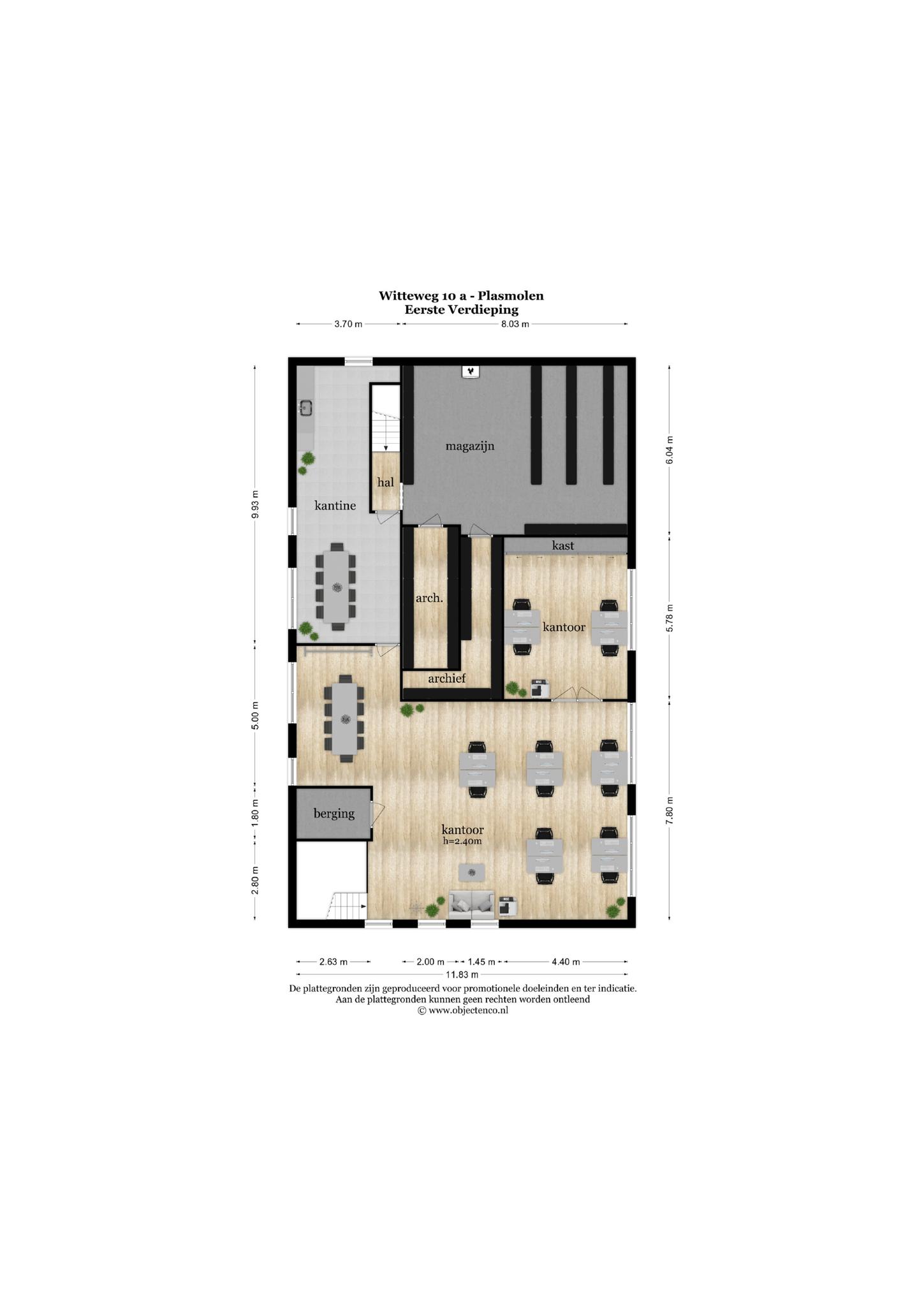 1e verdieping: kantoorruimte, bergkast, kantine, magazijn en archiefruimte.