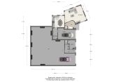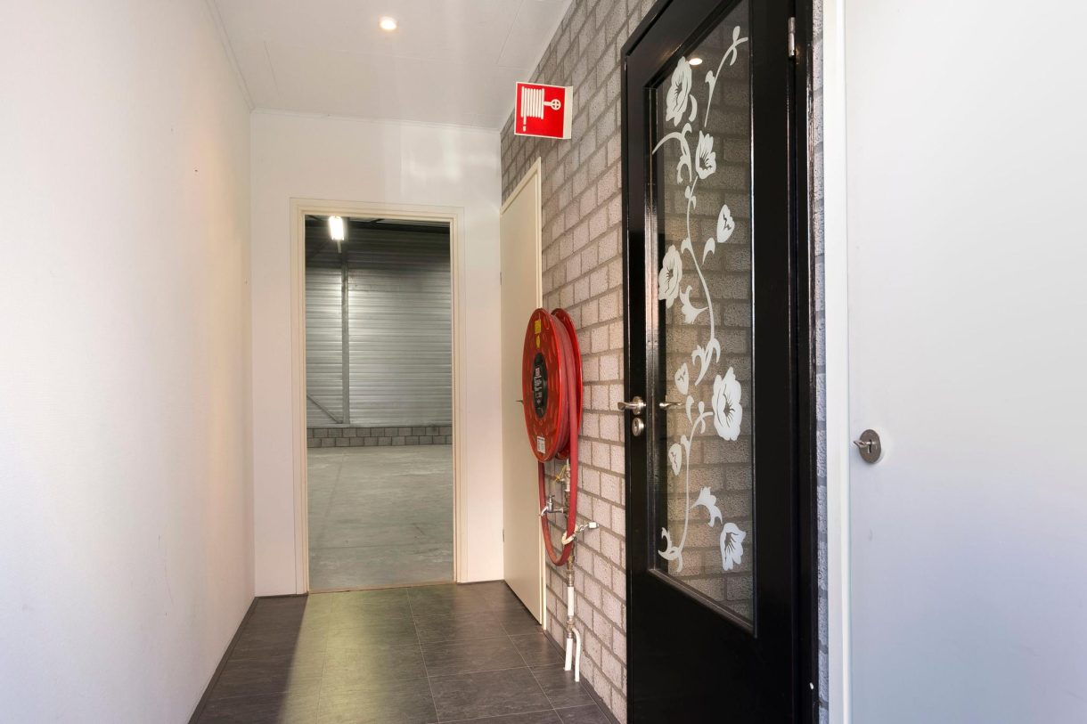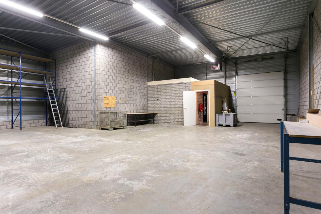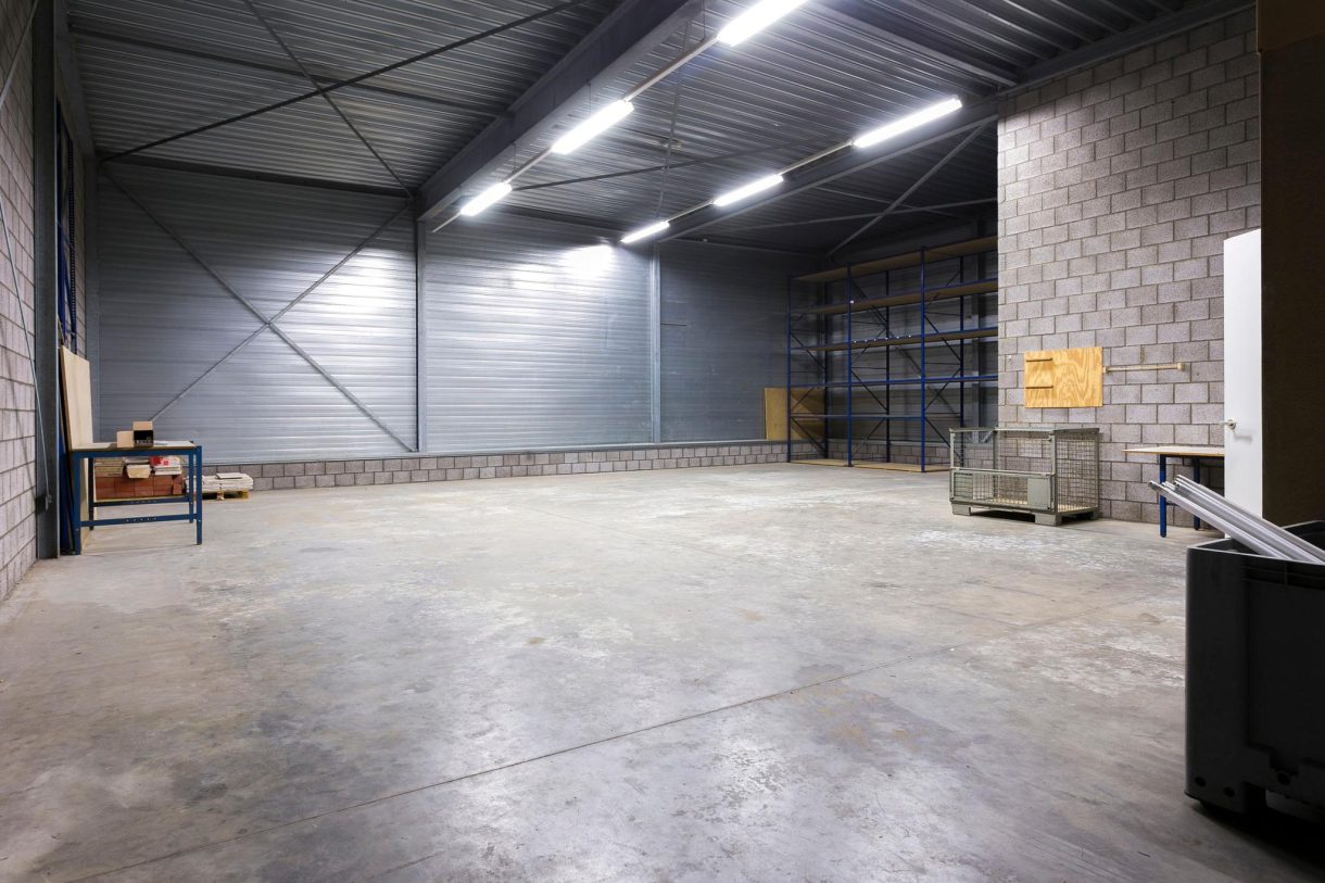 Recent gebouwde hal 5 meter hoog met grote overheaddeur / ingang met gang / kantoortje / keuken en toilet / totaal ca. 200 m2. De hal is goed geïsoleerd en verwarmbaar middels heater. Toegang via perceel 1305 “succes leesmappen” middels recht van overpad.