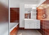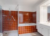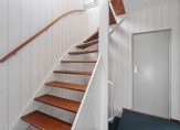 Overloop met toegang tot drie goed bemeten slaapkamers, waarvan een met wastafel en ingebouwde kast, en de grote badkamer, voorzien van een ligbad, douche, toilet en wastafelmeubel. Boven de garage bevindt zich een praktische bergruimte, ideaal voor seizoensspullen of als extra opslag.