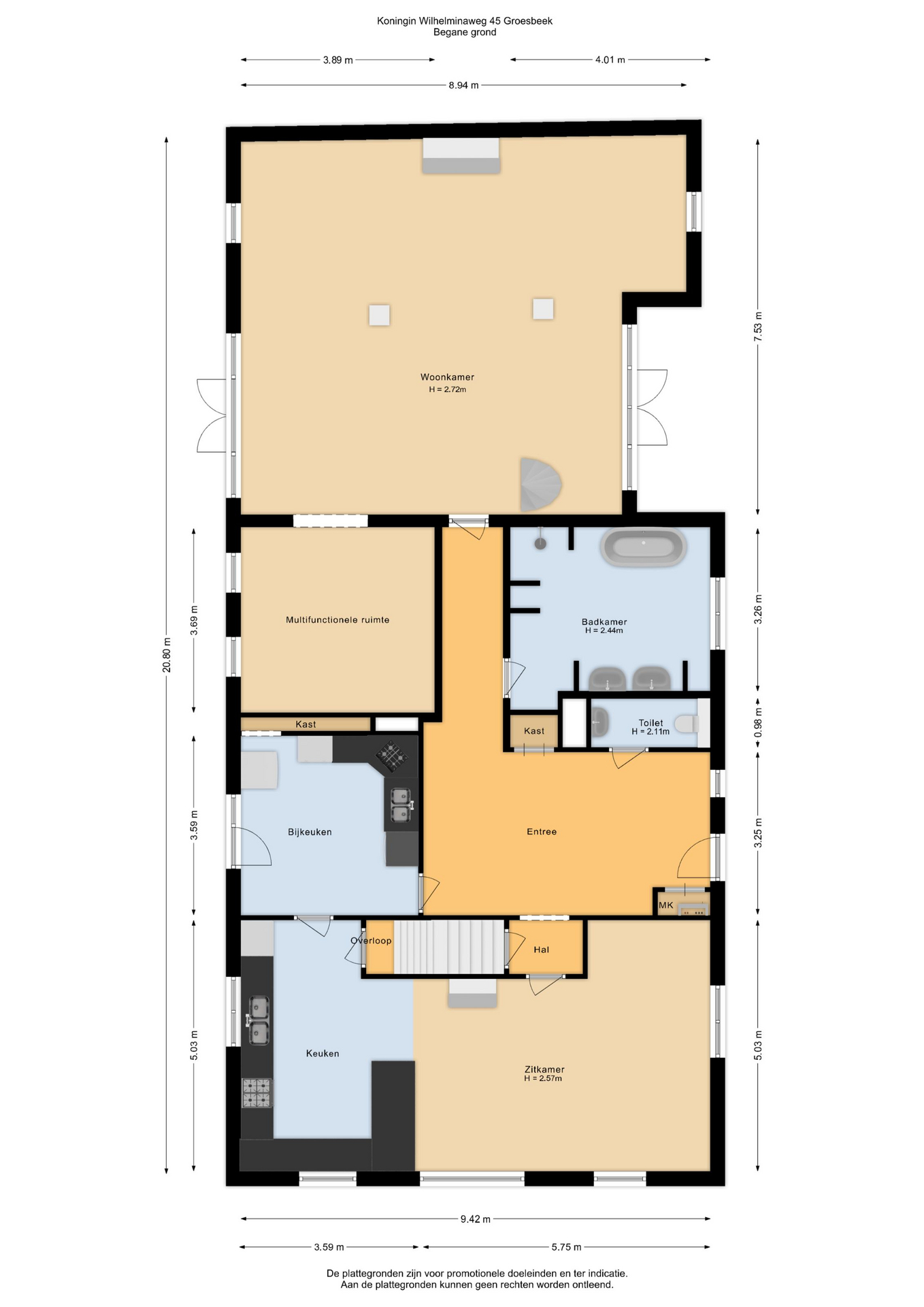 Entree met hal en ruim toilet. De gezellige woonkeuken is voorzien van een estriken vloer, open haard en ruimte voor een royale eettafel. Aangrenzend bevindt zich de bijkeuken met achterdeur en aansluitingen voor was apparatuur.