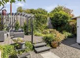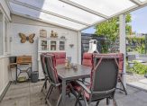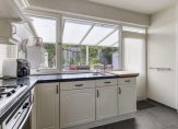 Indeling: Entree / hal met garderobe, meterkast, bergkast met opstelling voor wasmachine en droger / toilet met inbouwreservoir en fontein / ruime woonkamer met laminaatvloer, convectorput, sfeervolle schouw met houtkachel en open wenteltrap naar de verdieping / keuken met tegelvloer in hoekopstelling voorzien van gaskookplaat, afzuigkap, oven, koelkast en een vaatwasser / praktische bijkeuken met witgoedaansluitingen en bergruimte / vanuit de hal kunt u naar de slaapkamer / slaapkamer met directe toegang tot de tuin en de badkamer / luxe badkamer voorzien van een inloopdouche, wastafelmeubel, 2e toilet met inbouwreservoir en design radiator / fraai aangelegde zonnige achtertuin met overkapping, vijverpartij en een houten berging.