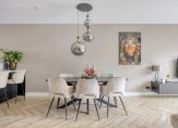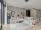 * De woonkamer is v.v. een strak gestuukt plafond met een stukrand;