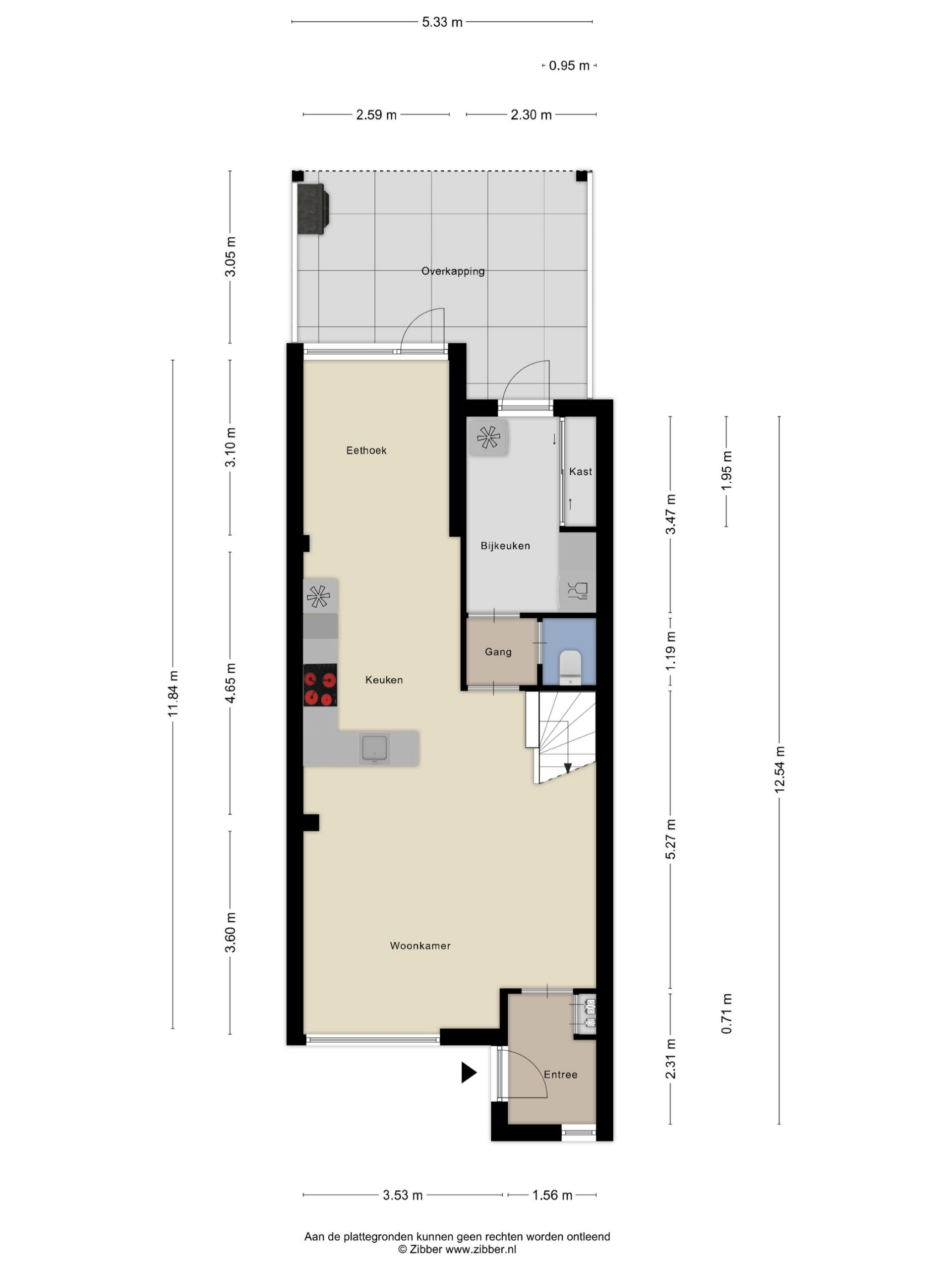 Indeling: Entree / hal met meterkast (7 groepen, dubbel 220V en aardlekschakelaar) / royale woonkamer met trap naar 1e verdieping, fraai glad gestukt plafond en eiken parketvloer (tapies gelegd) / open keuken voorzien van Bosch combioven, Siemens inductie kookplaat, Siemens afzuigkap, Siemens koel-/vriescombinatie, apothekerskast en uitgebouwde eetkamer met lichttube met directe toegang tot de achtertuin / toilet / bijkeuken met vaatwasser, vaste kast en toegang tot de achtertuin / fraai aangelegde zonnige achtertuin met aluminium overkapping met verlichting, een achterom en grenst aan waterpartij.