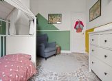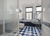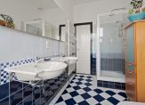 Overloop / twee slaapkamers / badkamer met ligbad, douche, twee wastafels en toilet.