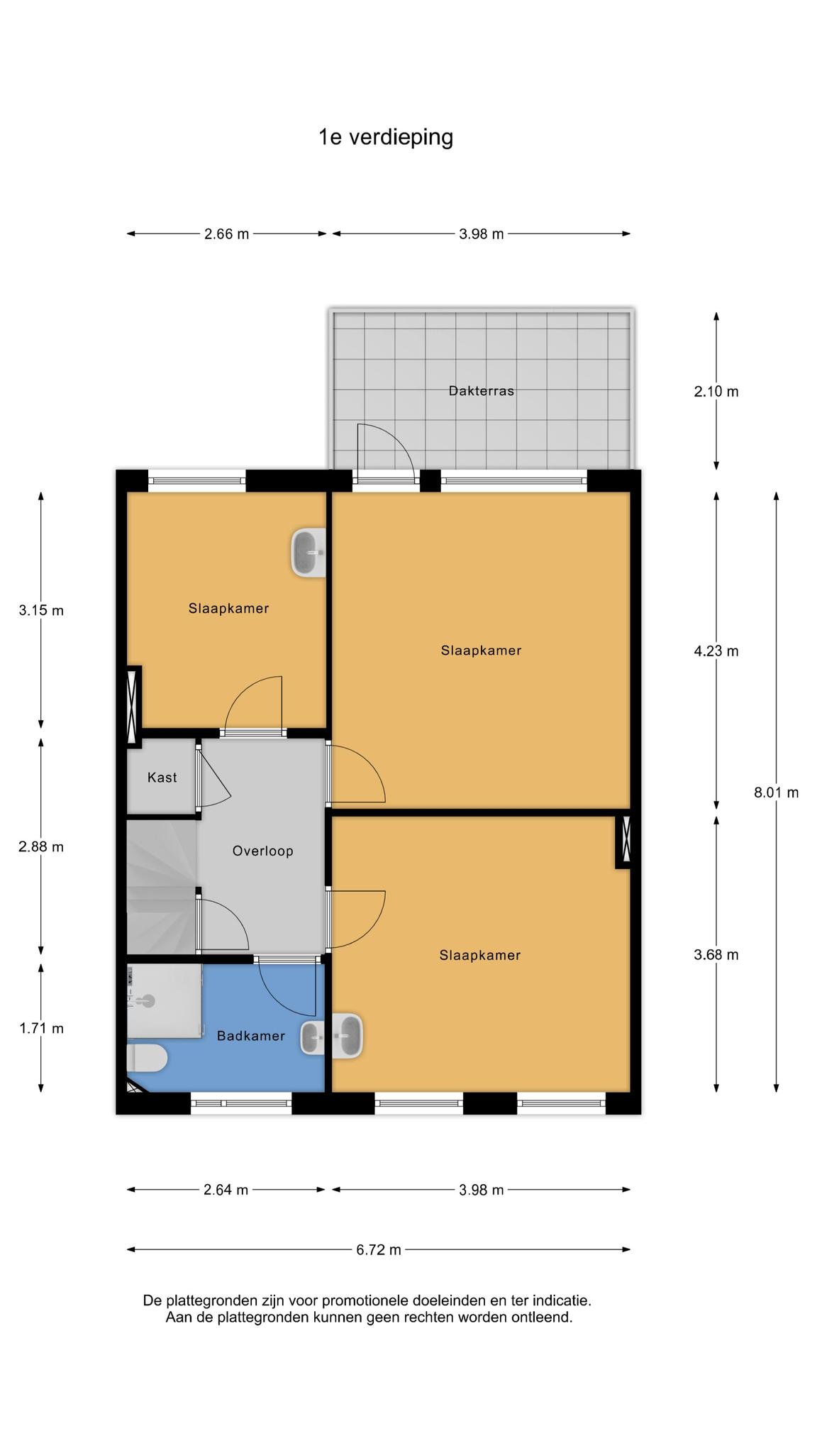 Eerste verdieping: op de eerste verdieping bevinden zicht drie slaapkamers, twee grote en een kleinere. De grote slaapkamers zijn voorzien van nieuwe draai-/kiep ramen met dubbel glas en de achterste kamer heeft een deur naar een dakterras op de aanbouw. De badkamer is sober en voorzien van een douche, 2e toilet en een wastafel. Via een vaste trap is de tweede verdieping bereikbaar.