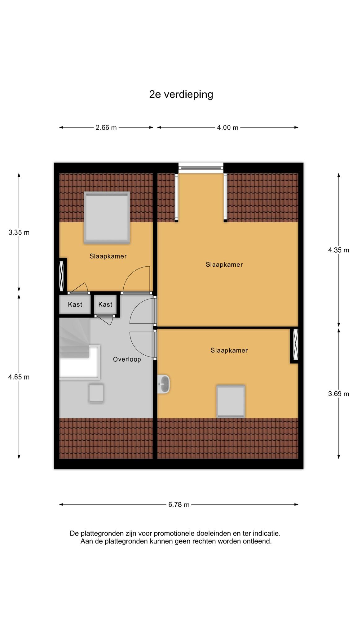 Tweede verdieping: overloop met kast en dakvenster / kleine kamer met groot dakraam en inbouwkast / twee slaapkamers, één met dakkapel (achter) en één met dakvenster / vliering aanwezig van ongeveer 1,5 x 3,5 m.