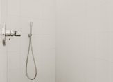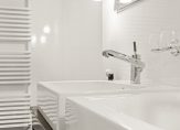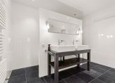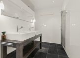 De moderne badkamer is uitgerust met twee vaste wastafels, een tweede toilet en een inloopdouche.