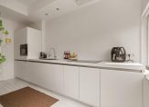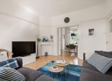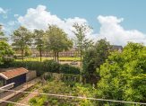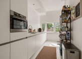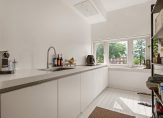 De keukenruimte heeft raampartijen over de hele breedte waardoor je veel lichtinval hebt én een prachtig uitzicht. Je loopt vanuit de keuken rechtstreeks het balkon op. Ook is er een toegang naar de woonkamer met twee inbouwkasten en een originele schouw.