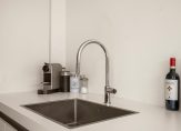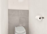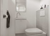 1e verdieping: moderne toiletruimte met hangend closet, fonteintje en buitenraampje. De strakke keuken, uitgevoerd in een frisse wittint met een extra diep aanrecht bevindt zich aan de achterzijde van de woning en is voorzien van een inductiekookplaat, vaatwasser, koel/vriescombinatie en oven.