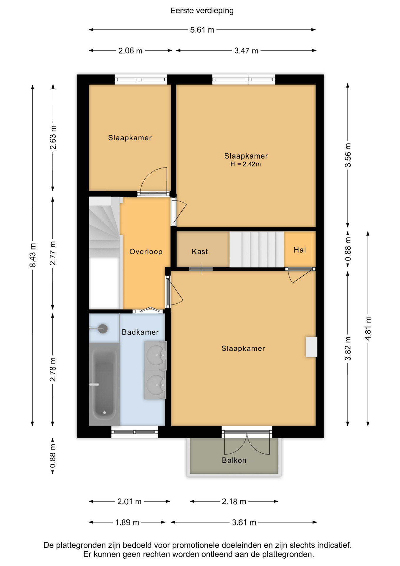 drie slaapkamers, twee grotere en รฉรฉn kleinere slaapkamer. Via รฉรฉn van de grootste slaapkamers aan de voorzijde van de woning zit een deur naar de trap naar de zolder en een deur naar het balkon gelegen op het zuiden. Ook bevindt er een badkamer met ligbad, douche en dubbele wastafel.