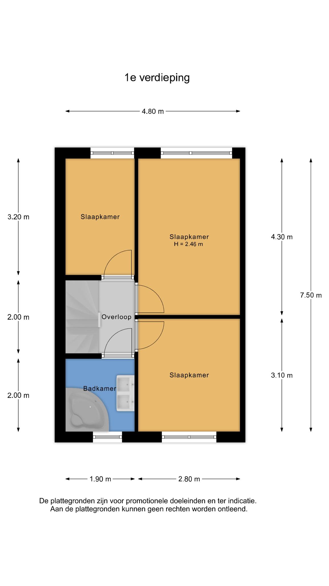 Drie slaapkamers van goed formaat. De badkamer heeft een hoekbad, wastafel met ombouw en een bovenlicht. Op de overloop is tevens de vaste trap naar de tweede verdieping.