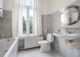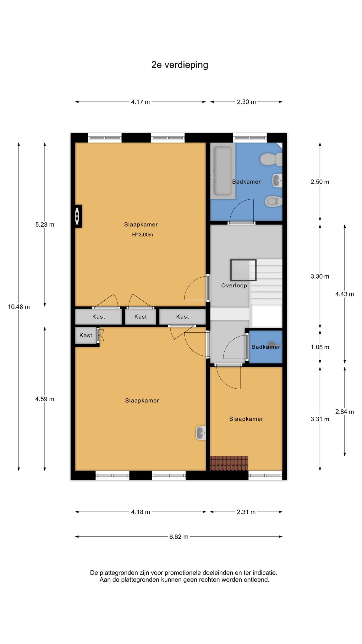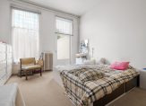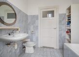 Tweede verdieping: gedateerde badkamer, twee ruime slaapkamers, douche, kleine slaapkamer.