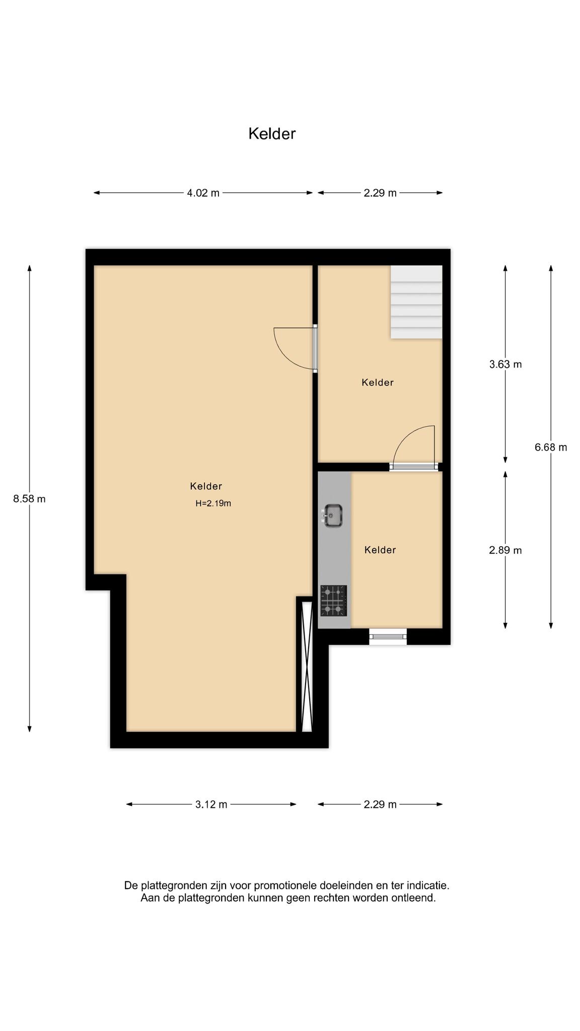 Kelder: provisiekelder met granitovloer en meterkast, keukentje, kamer met buiteningang, totaal ca. 44 mยฒ met een hoogte van 2,18m. Dit souterrain is in het verleden als appartementje bewoond.