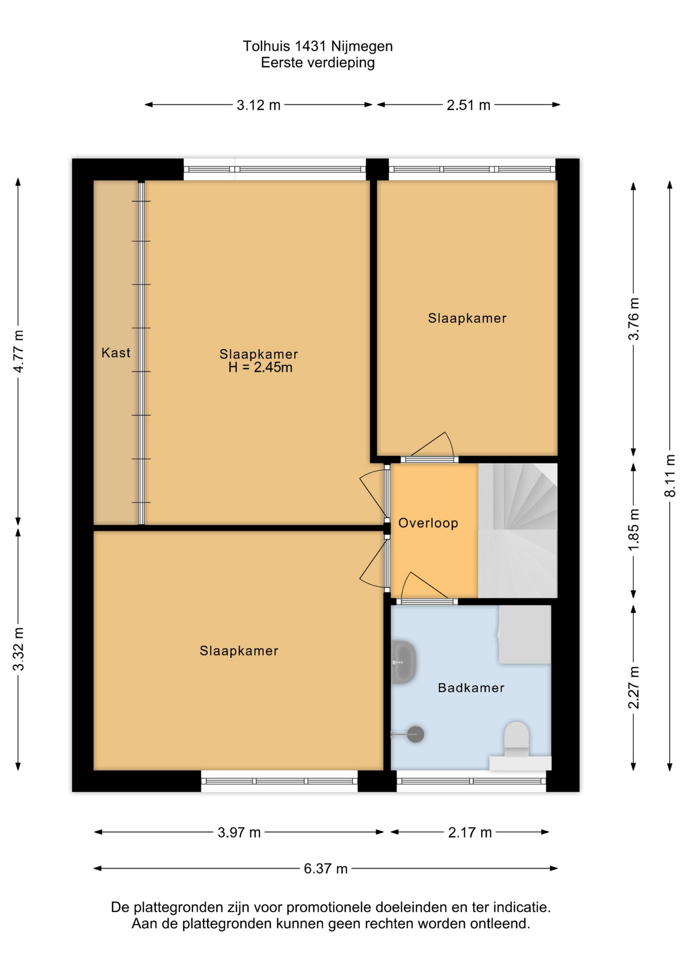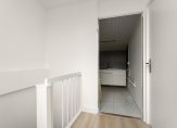 Op de eerste verdieping bevinden zich drie slaapkamers, waaronder รฉรฉn met een ingebouwde kast. De kamers zijn praktisch in te delen en geschikt als slaap-, werk- of logeerkamer. De nette badkamer is voorzien van een wastafel, toilet en douche.