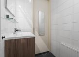 Het appartement heeft verder een ruime hoogslaper (2 persoons) en een zelfstandige badkamer met een douche, vaste wastafel, een toilet en de aansluitingen voor de wasmachine en droger.