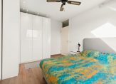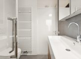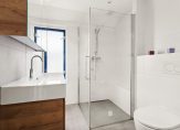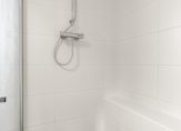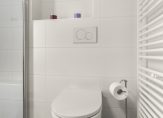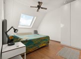 Overloop met toegang naar de drie slaapkamers. Twee slaapkamers hebben een schuin dak met een dakraam. De badkamer beschikt over een inloopdouche, brede wastafel met meubel en tweede toilet en is in 2021 nieuw geplaatst.