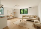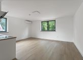 De leefruimte is voorzien van een mooie doorlopende houten vloer, frisse witte wanden en meerdere ramen die zorgen voor een prettige, natuurlijke lichtinval. Vanuit de studio kijk je uit op groen, wat de ruimte een rustige en aangename sfeer geeft.