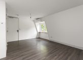 De studio heeft een mooie donkere houtlook vloer die direct opvalt en zorgt voor een warme uitstraling. De schuine wanden en het grote raam geven de ruimte een speels karakter, terwijl het uitzicht op groen voor rust en privacy zorgt.