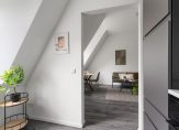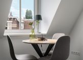 Het appartement bereik je via de gezamenlijke voordeur, waar ook de meterkast van het appartement zich bevindt. Vervolgens lopen we naar boven en ligt het appartement op de tweede verdieping. De woning is nรฉt opgeleverd en dat zie je terug in de strakke afwerking: glad gestucte witte muren en een nette vloer geven het geheel een frisse en eigentijdse uitstraling. De lichte woonkamer biedt voldoende ruimte voor een comfortabele zithoek en een gezellige eettafel. Dankzij de twee dakkapellen valt er veel daglicht naar binnen. Ook de plafondhoogte zorgt voor een goede en ruime indruk.