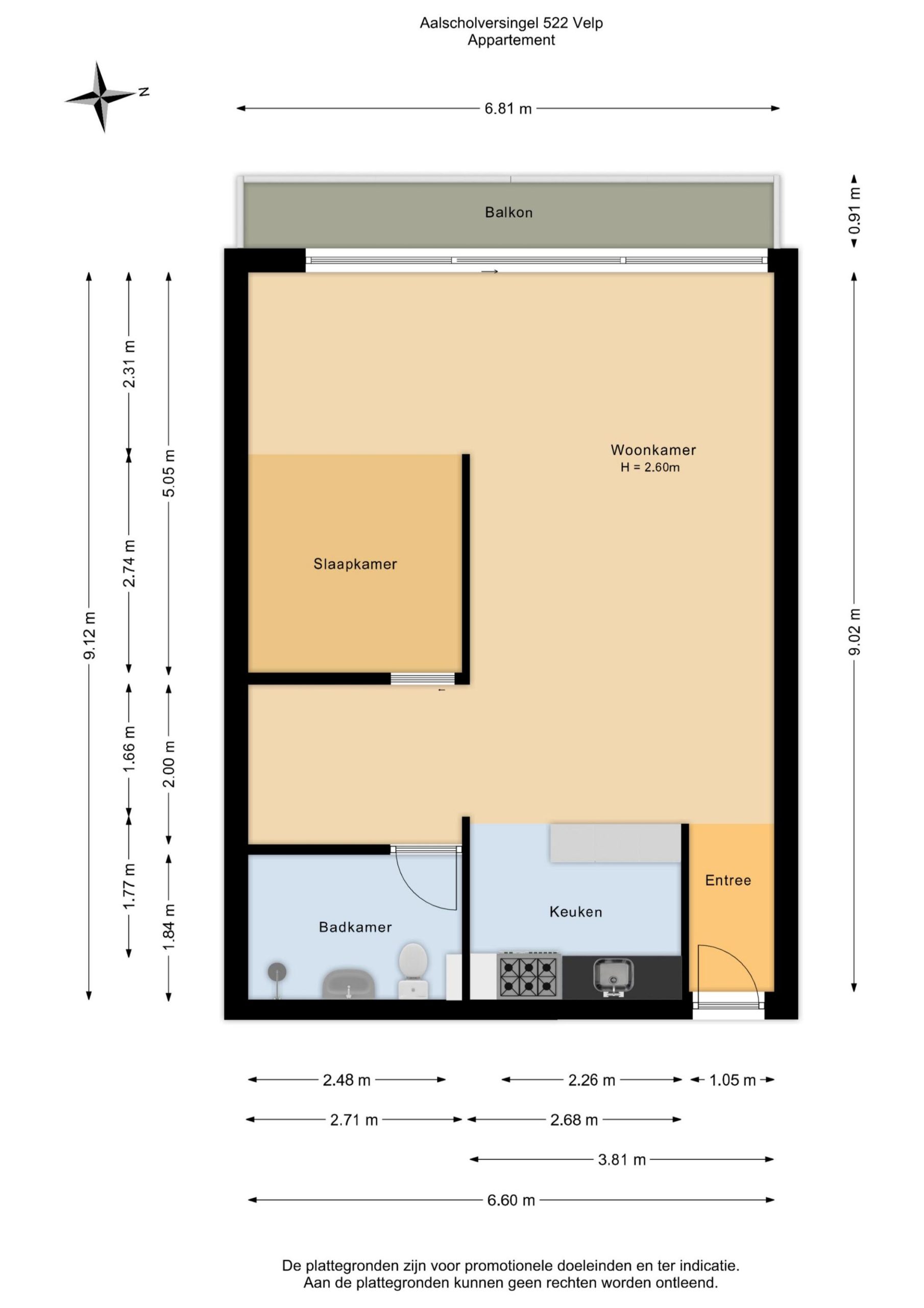 entree, hal, woonkamer met schuifpui naar het balkon. Vanuit de woonkamer uitzicht op de waterpartij en groen. Open, doch eenvoudige keuken met keukenblok en elektrisch kooktoestel met oven.